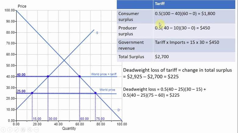What does the tariff do? It raises the price in America, which encourages US producers to make more stuff. Suddenly US production in this graph jumps from 15 to 30. With a higher price and more units, producer surplus leaps from $112.50 to $450: fully four times larger than before. Shareholders sing all the way to the bank, manufacturing employment goes up, all that jazz. The government is also collecting more revenue. Huzzah!
